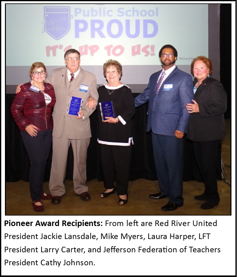 In presenting the awards, LFT President Larry Carter said, “These two Federation members, from each end of the Louisiana, represent what is best about education unionism. They both dedicated their professional lives to the children they served, and worked to build the LFT into the largest and most effective advocate for teachers and school employees in the state.”